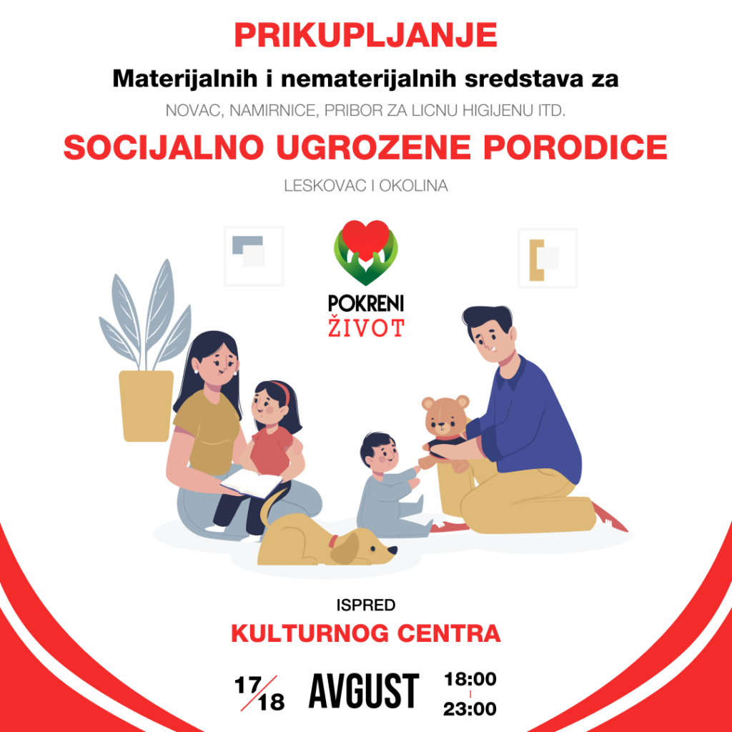 Humanitarna organizacija “Pokreni život” će sa svojim volonterima 17. i 18. avgusta od 18 do 23 časa na platou ispred Leskovačkog kulturnog centra, prikupljati materijalna i nematerijalna sredstva za socijalno ugrožene porodice u Leskovcu i okolini.