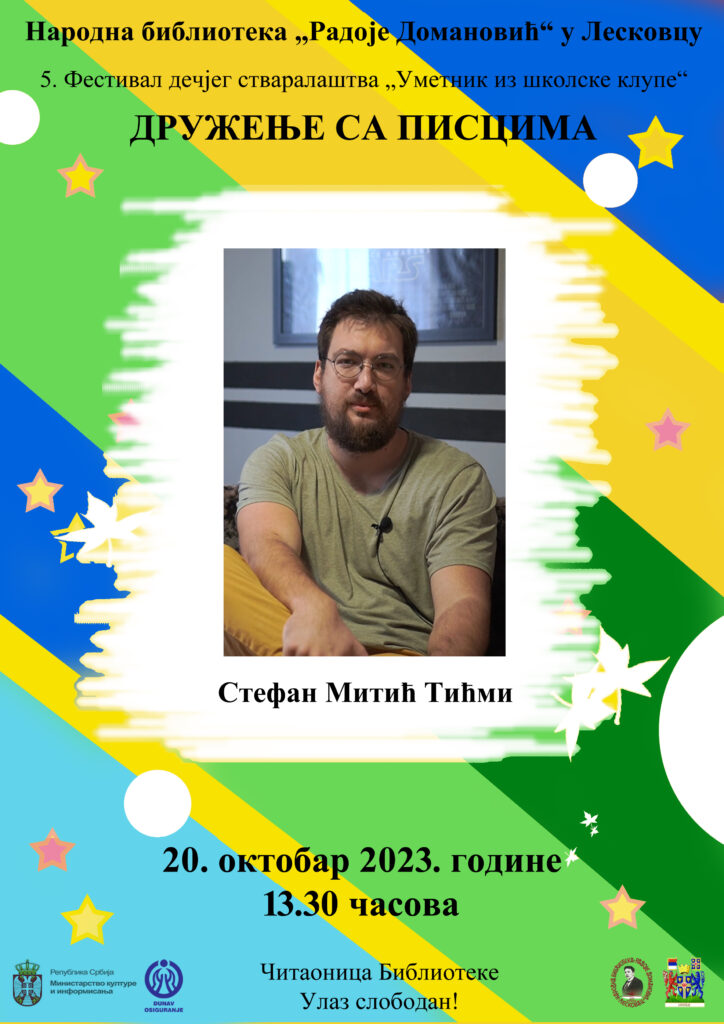 Narodna biblioteka „Radoje Domanović“ u Leskovcu, u okviru 5. Festivala dečjeg stvaralaštva „Umetnik iz školske klupe“, u petak 20. oktobra 2023. godine u 13.30 časova, organizuje druženje sa piscem Stefanom Mitićem.
