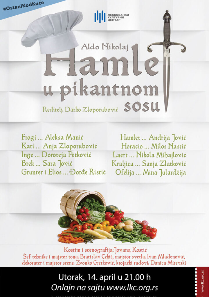 Večeras sa početkom od 21 čas na programu je predstava “Hamlet i pikantnom sosu” u režiji Darka Zloporubovića i po tekstu Alda Nikolaja, rađena 2016. godine u produkciji Leskovačkog kulturnog centra. U predstavi su igrali učenici srednjih škola, a izvođena je i u okviru programa „Noć pozorišta“.
