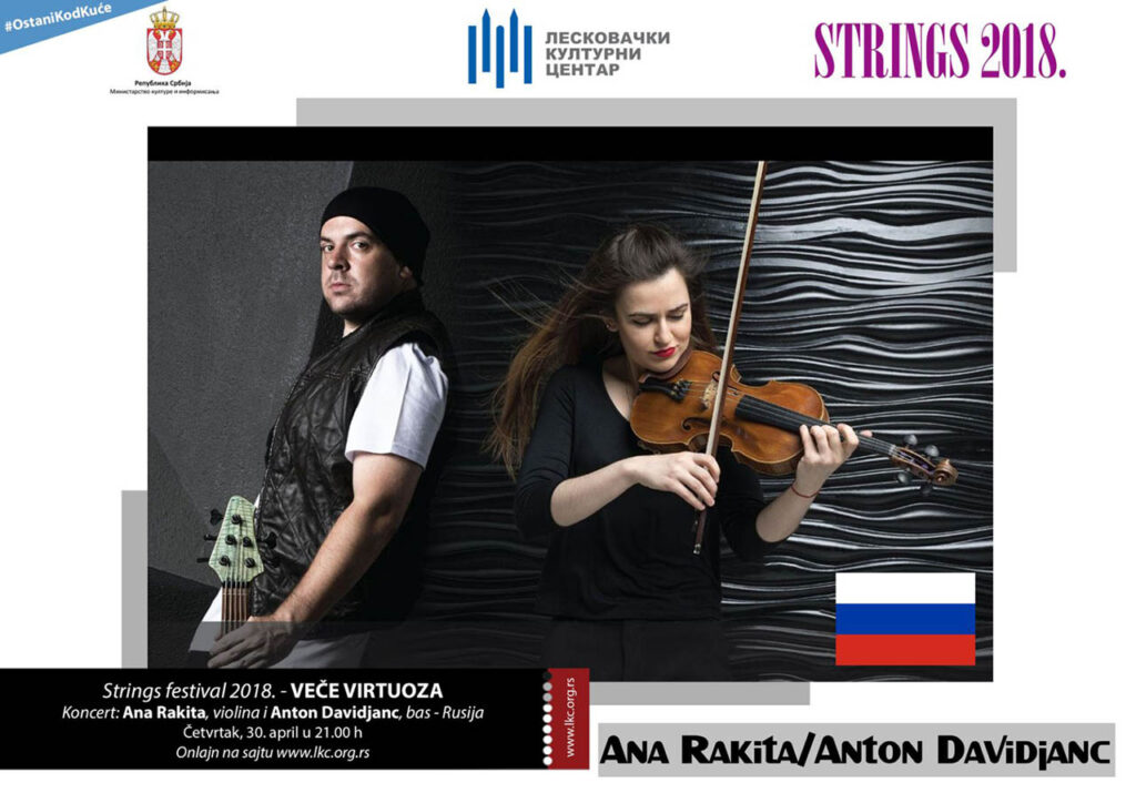 Večeras na sajtu Leskovačkog kulturnog centra www.lkc.org.rs, u 21 čas biće prikazan duet talentovane violinistkinje Ane Rakite i svetski poznatog basiste Antona Davidjanca, koji su nastupili na Strings festivalu u Leskovcu 2018.godine.