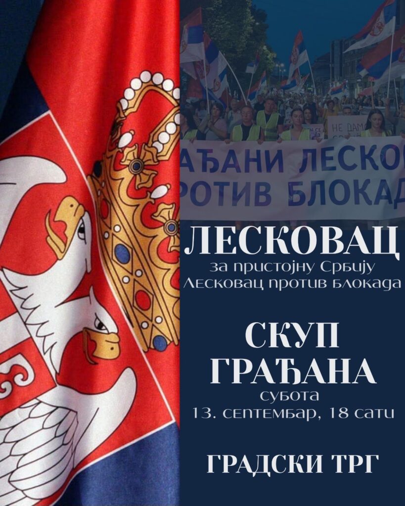 Skup građana pod nazivom „Leskovac za pristojnu Srbiju – Leskovac protiv blokada“ održaće se u subotu, 13. septembra. Okupljanje građana počeće u 18 sati na Gradskom trgu.