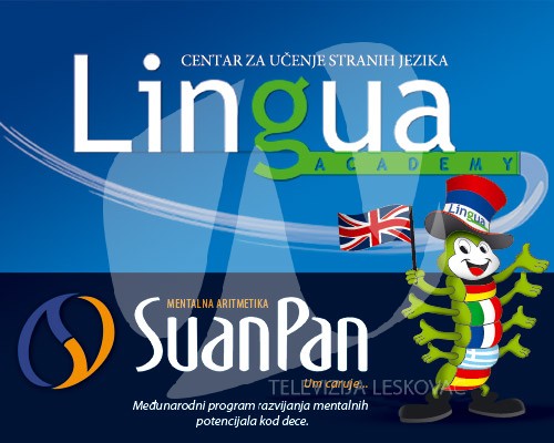 lingua-tvlLESKOVAC – Škola starnih jezika Lingua academy prva je u Jablaničkom okrugu u svoj obrazovni program uvela metodu Mentalne aritmetike Suan Pan istakla je profesorka Milica Dosev Stojanović. Po njenim rečima interesovanje dece za ovaj program je veliko i već su skoro popunjena odeljenja, mada se još može naći po koje slobodno mesto.