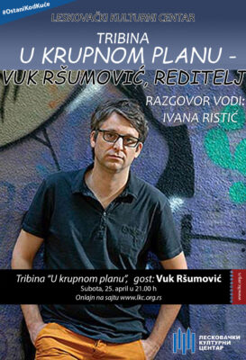 Na sajtu Leskovačkog kulturnog centra, www.lkc.org.rs, sutra u 21 čas biće prikazana tribina „U krupnom planu“ na kojoj je Vuk Ršumović, reditelj, scenarista i dramaturg, gostovao 30. novembra 2016. godine u okviru Leskovačkog internacionalnog filmskog festivala LIFFE.