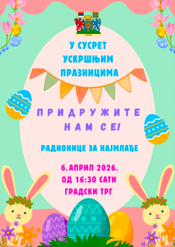 Uoči velikog praznika Uskrsa, u ponedeljak, 6. aprila sa početkom u 16:30 sati, Grad Leskovac će na centralnom gradskom trgu organizovati uskršnje radionice za najmlađe, uz podršku, Turističke organizacije Leskovac, Predškolske ustanove „Vukica Mitrović“, privatnih vrtića Agnes, Vil, Zvezdica, Plavi čuperak, Biberče i Auto-stop, kao i Muzičke škole „Stanislav Binički“.