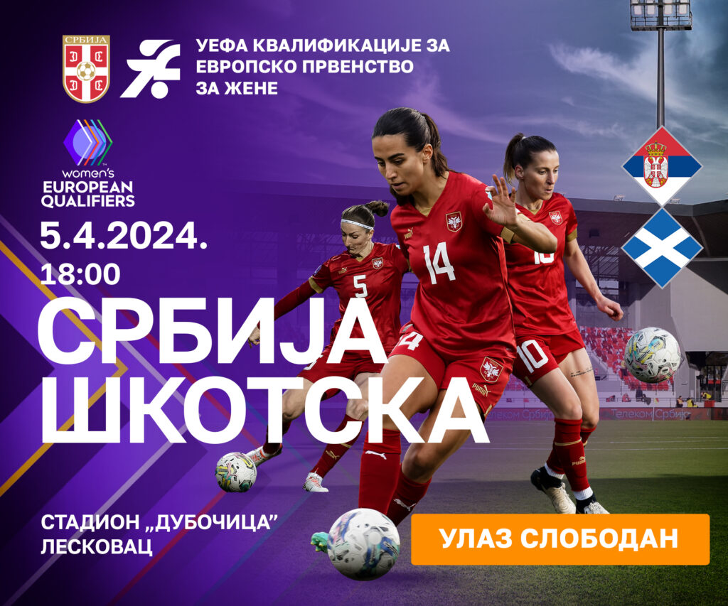 Ženska fudbalska selekcija Srbije će u petak 5. aprila odigrati sa selekcijom Škotske prvu utakmicu UEFA kvalifikacija za plasman na Evropsko prvenstvo 2025. Utakmica će se održati na Gradskom stadionu „Dubočica“ sa početkom u 18 časova. Ulaz je slobodan i ulaznice će moći da se preuzmu na blagajni stadiona ‘’Dubočica’’, na dan utakmice, od 16 sati, obaveštavaju iz Fudbalskog saveza Srbije.
